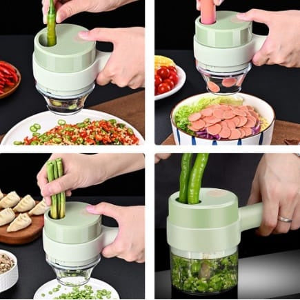 Com ele você pode ter um cortador de vegetais, picador de carne e ainda uma escova de limpeza elétrica ao mesmo tempo, apenas trocando os acessórios do conjunto multifuncional.